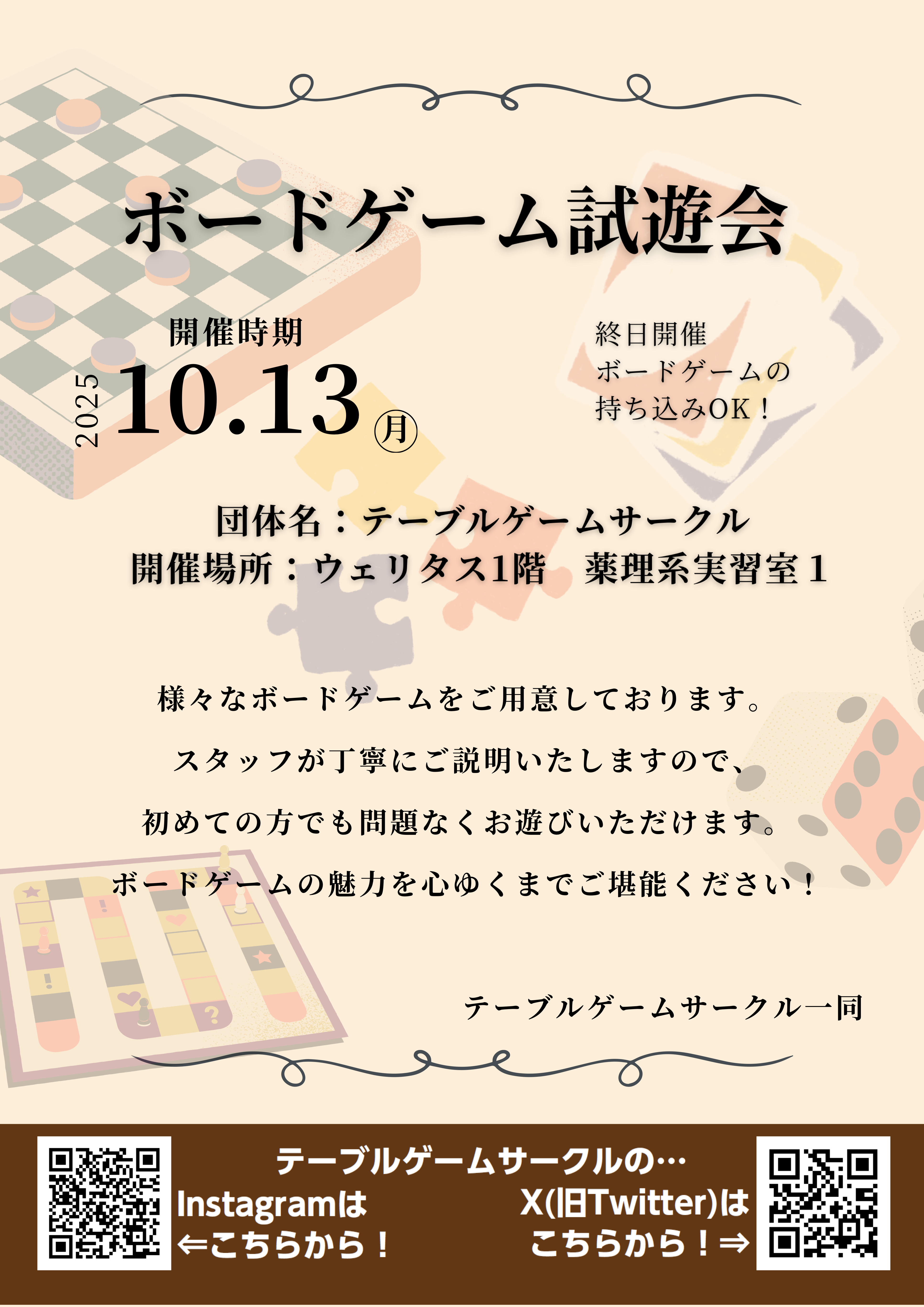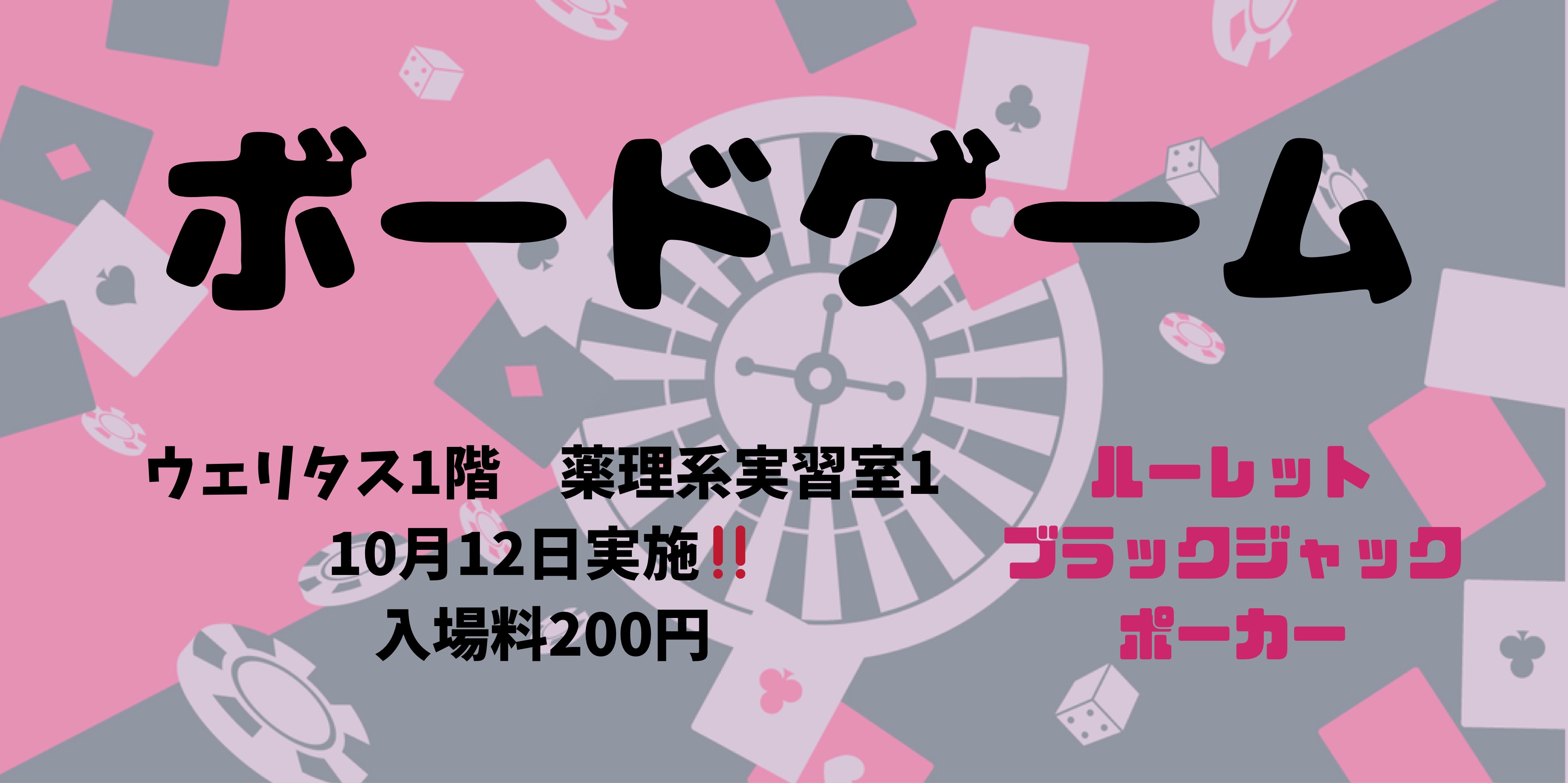 【テーブルゲームサークル】【実行委員会】(薬理系実習室1)ボードゲーム 1日目 終日 @ウェリタス1階薬理系実習室1 運営:大学祭実行委員会<ボードゲーム企画・有料(¥200)> 2日目 終日 @ウェリタス1階薬理系実習室1 運営:テーブルゲームサークル<ボードゲーム試遊会>