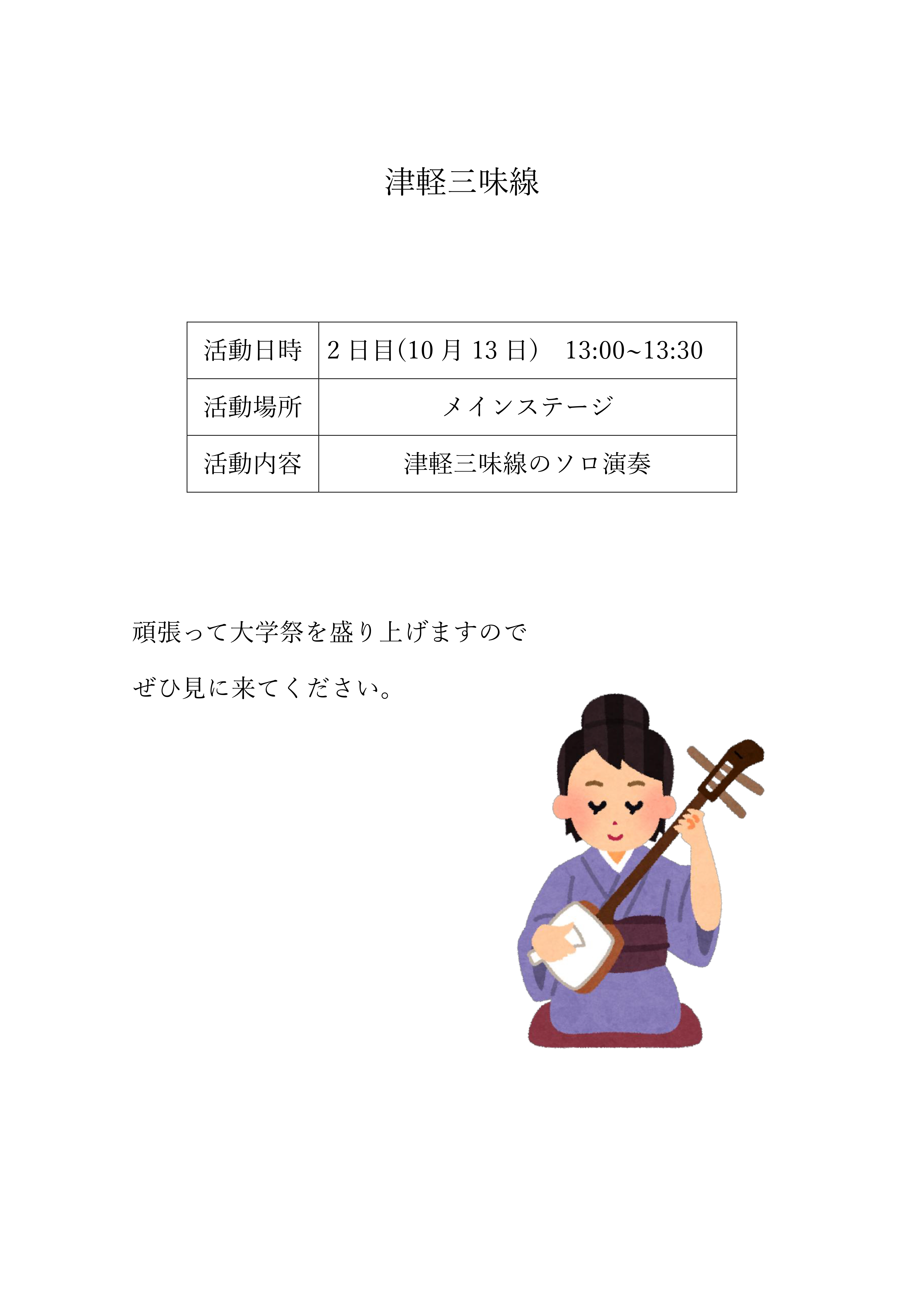 11:00~ 【変更有】津軽三味線 天候の影響により発表場所・発表時間ともに変更になりました 発表時間 2日目 13:00~13:30 @メインステージ11:00~11:30 @サブステージ 天候の影響により時間・会場が変更となりました(10/13 8:00) !パンフレットの情報は旧情報のまま掲載しています!